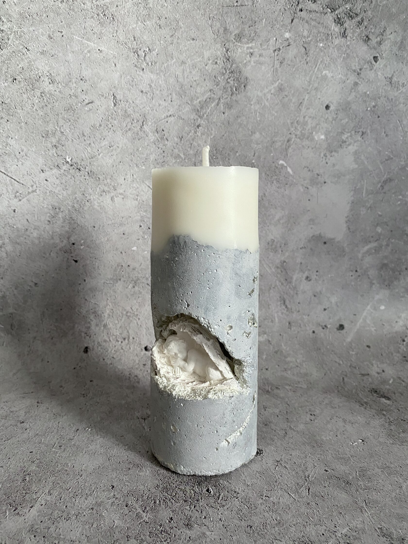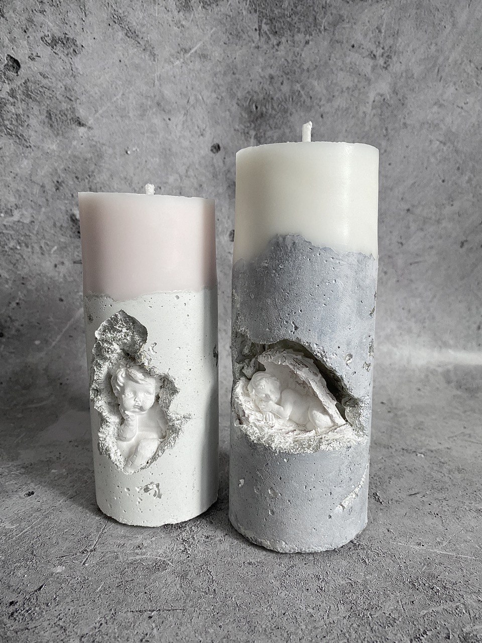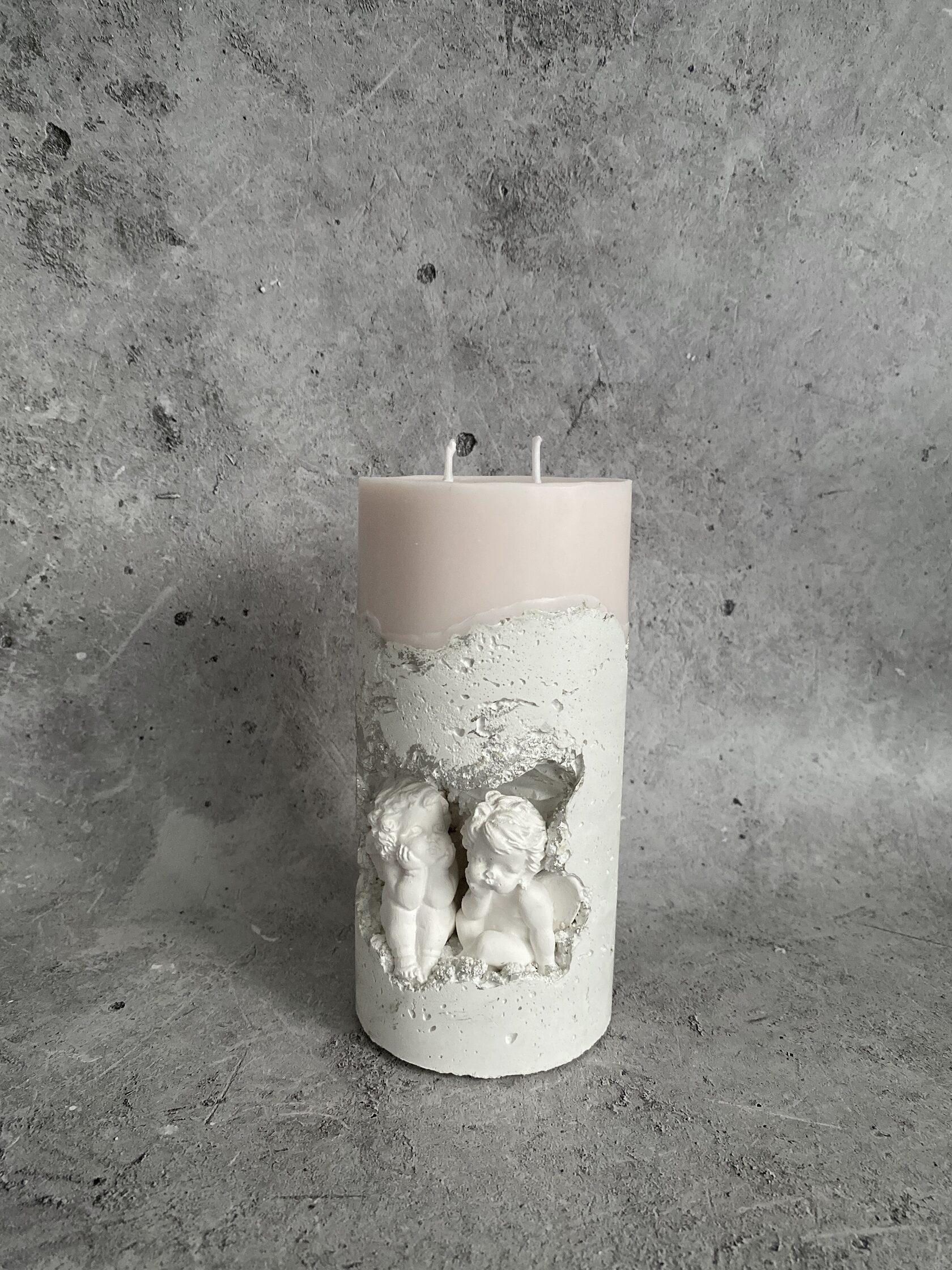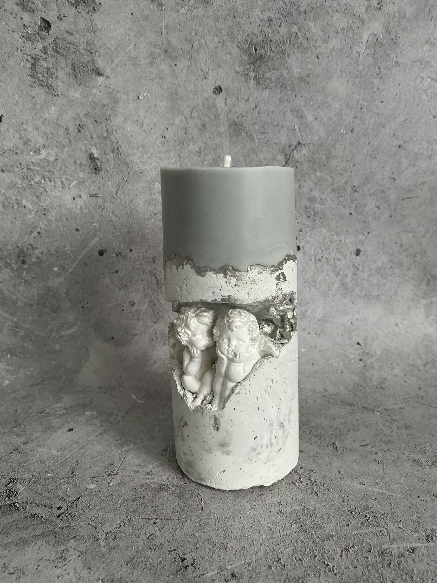 В самом сердце каменного ущелья, где суровые скалы хранят древние тайны, притаились два ангела. Не просто ангелы, а два Амура, чье присутствие наполняет это дикое место неземной красотой. Их нежность, их мечтательные лики, их античная грация создают невероятный контраст фактурой бетона. Ангелы, кажется, замерли в своих грезах, принося в этот мир частичку божественной любви. Это не просто подсвечник, это произведение искусства, где грубость и изящество, вечность и Все наши свечи можно гармонично компоновать между собой, создавая всё новые композициимимолетность сливаются воедино, рождая ощущен глубокой, почти осязаемой красоты.