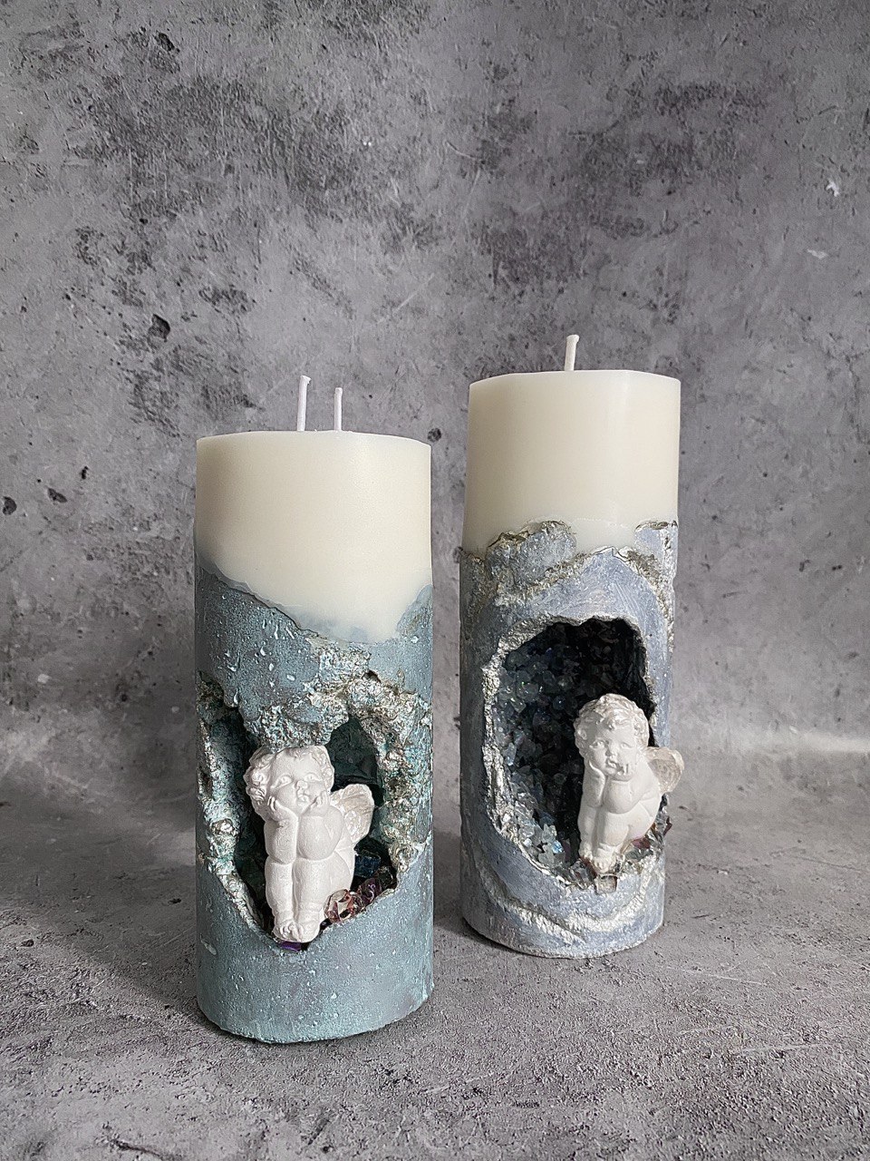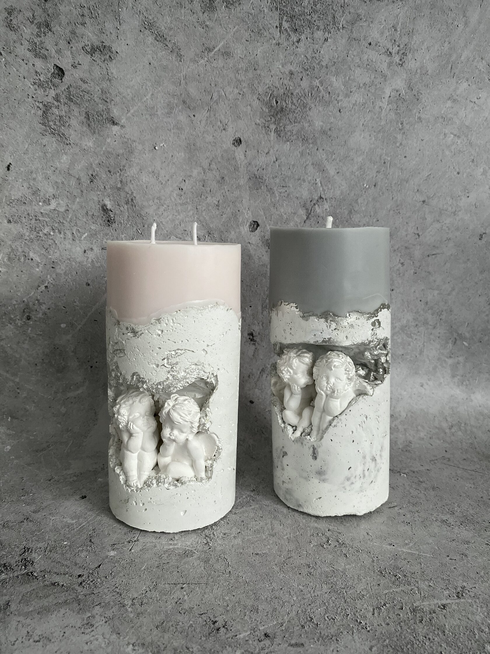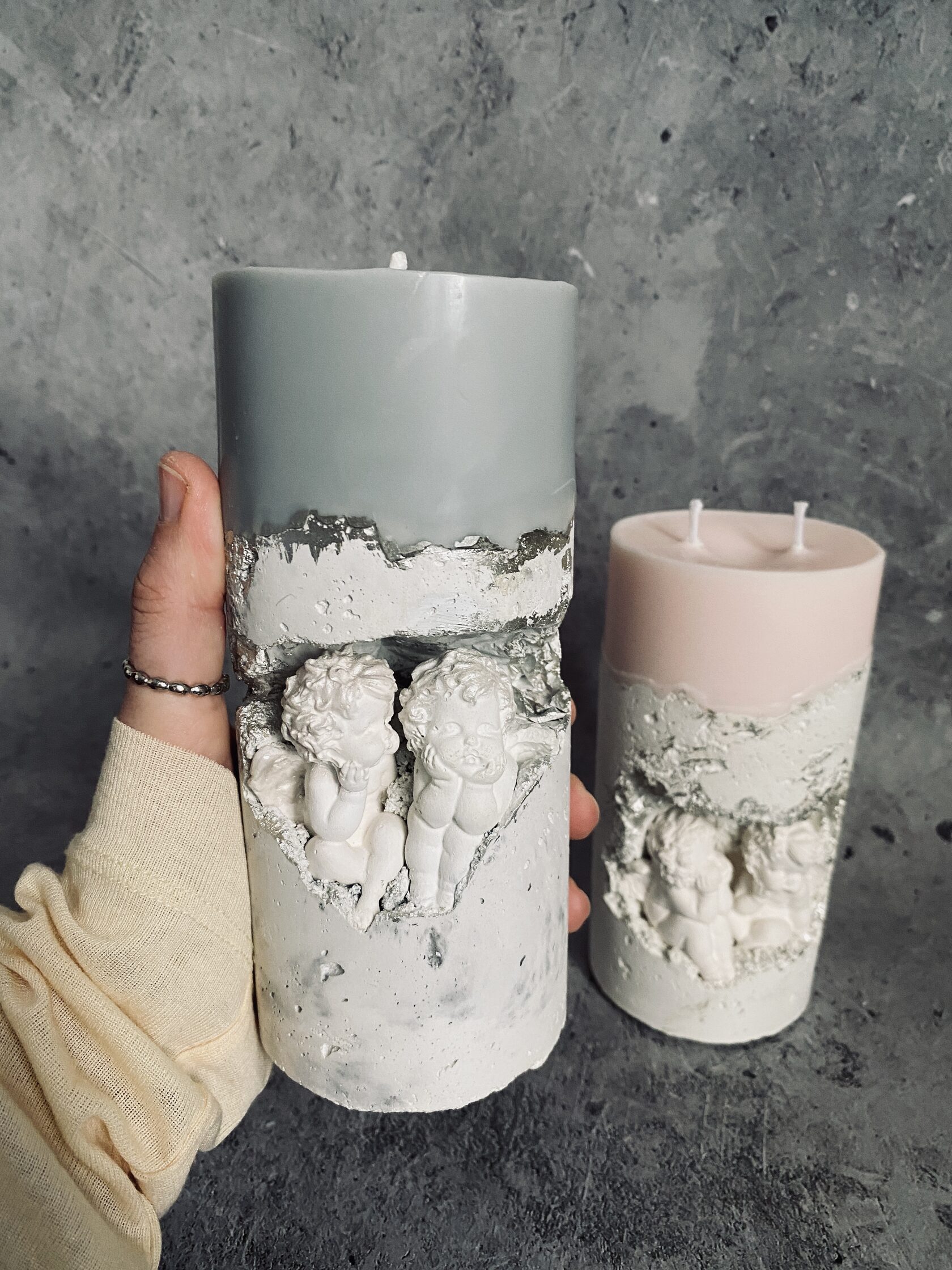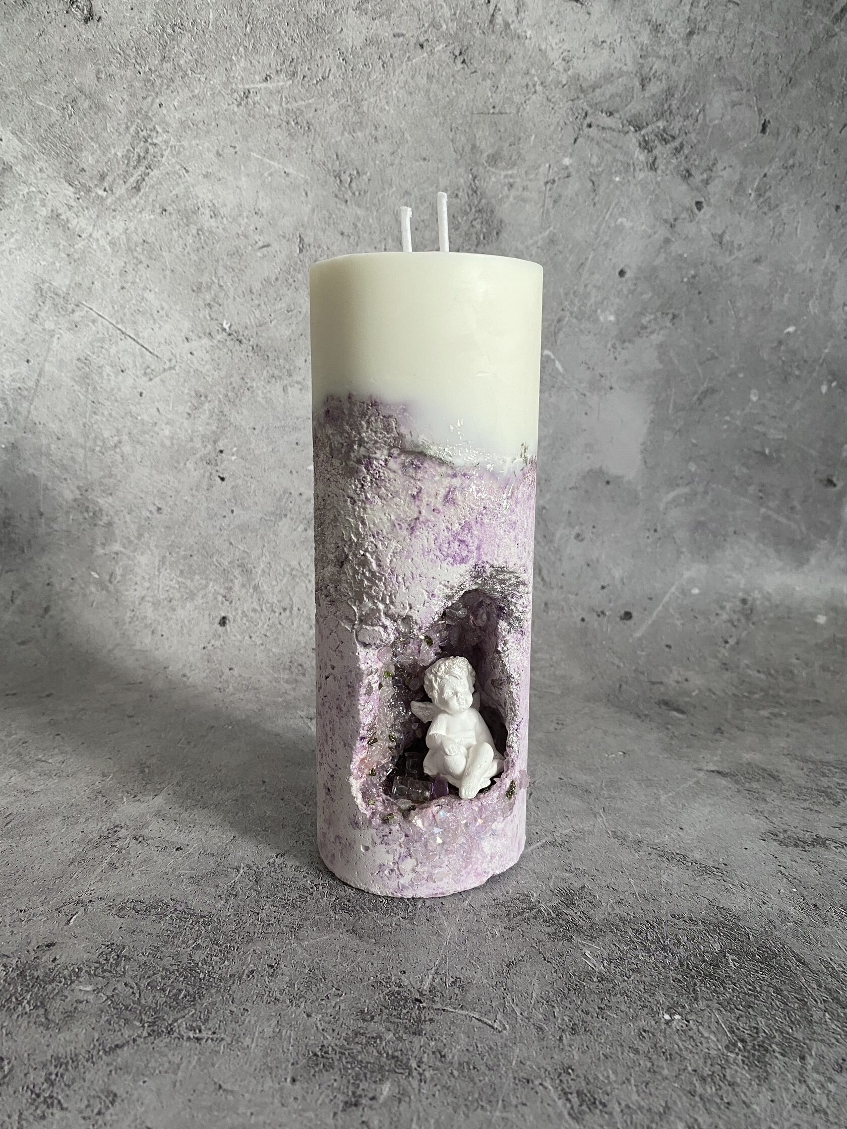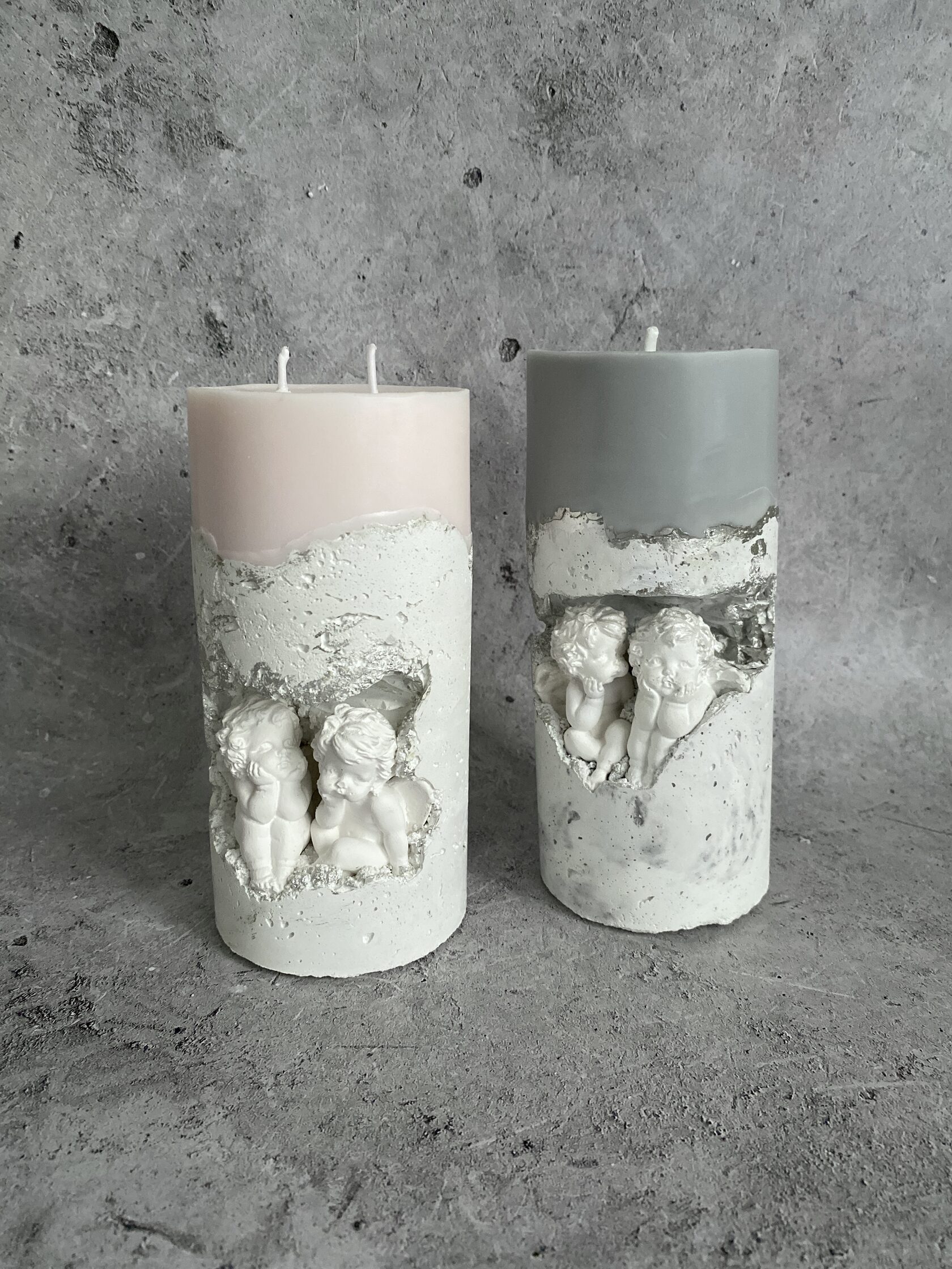 В самом сердце каменного ущелья, где суровые скалы хранят древние тайны, притаились два ангела. Не просто ангелы, а два Амура, чье присутствие наполняет это дикое место неземной красотой. Их нежность, их мечтательные лики, их античная грация создают невероятный контраст фактурой бетона. Ангелы, кажется, замерли в своих грезах, принося в этот мир частичку божественной любви. Это не просто подсвечник, это произведение искусства, где грубость и изящество, вечность и Все наши свечи можно гармонично компоновать между собой, создавая всё новые композициимимолетность сливаются воедино, рождая ощущен глубокой, почти осязаемой красоты.
