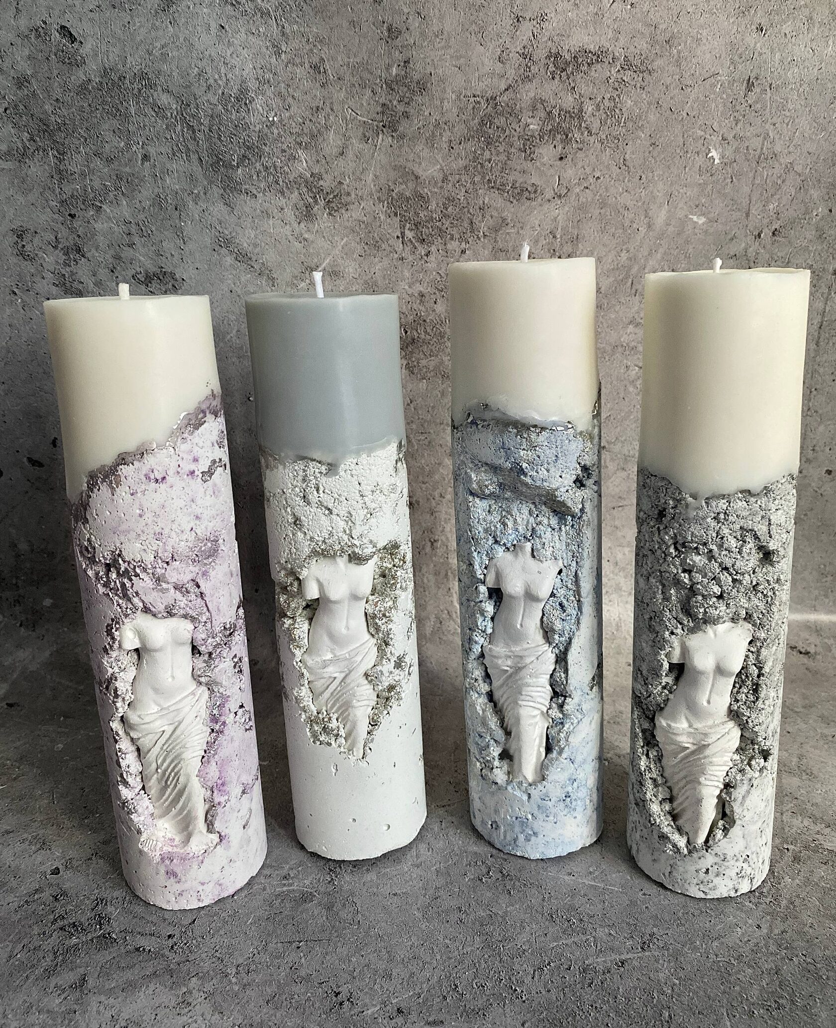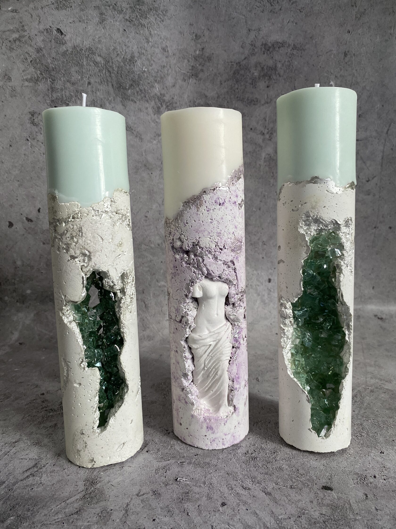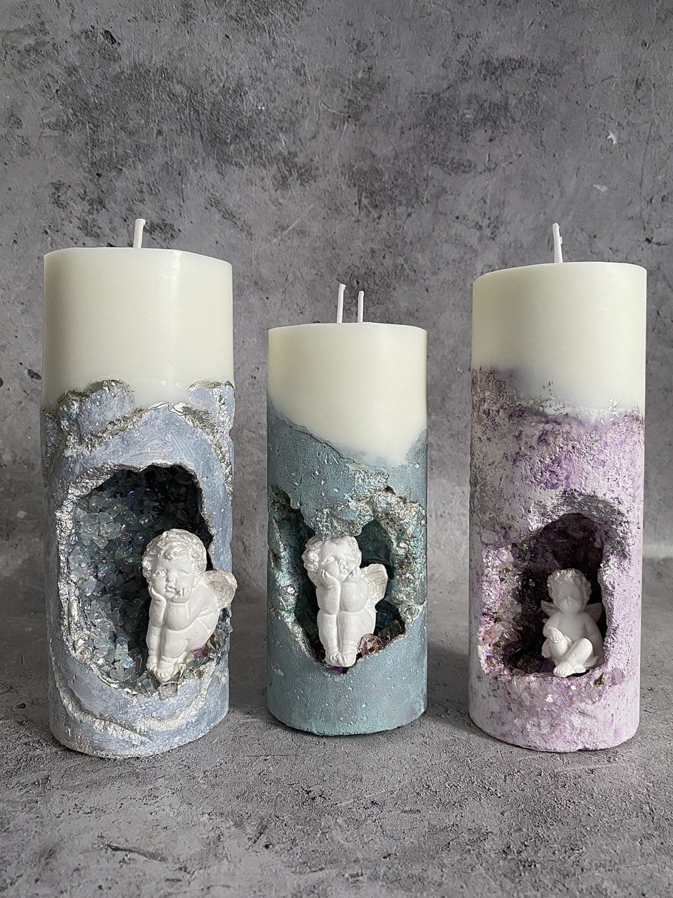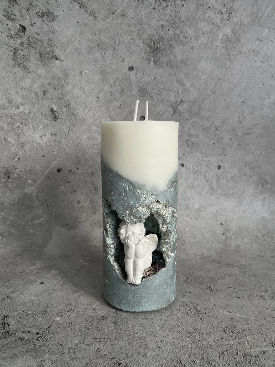 В самом сердце каменного ущелья, где суровые скалы хранят древние тайны, притаились два ангела. Не просто ангелы, а два Амура, чье присутствие наполняет это дикое место неземной красотой. Их нежность, их мечтательные лики, их античная грация создают невероятный контраст фактурой бетона. Ангелы, кажется, замерли в своих грезах, принося в этот мир частичку божественной любви. Это не просто подсвечник, это произведение искусства, где грубость и изящество, вечность и Все наши свечи можно гармонично компоновать между собой, создавая всё новые композициимимолетность сливаются воедино, рождая ощущен глубокой, почти осязаемой красоты.