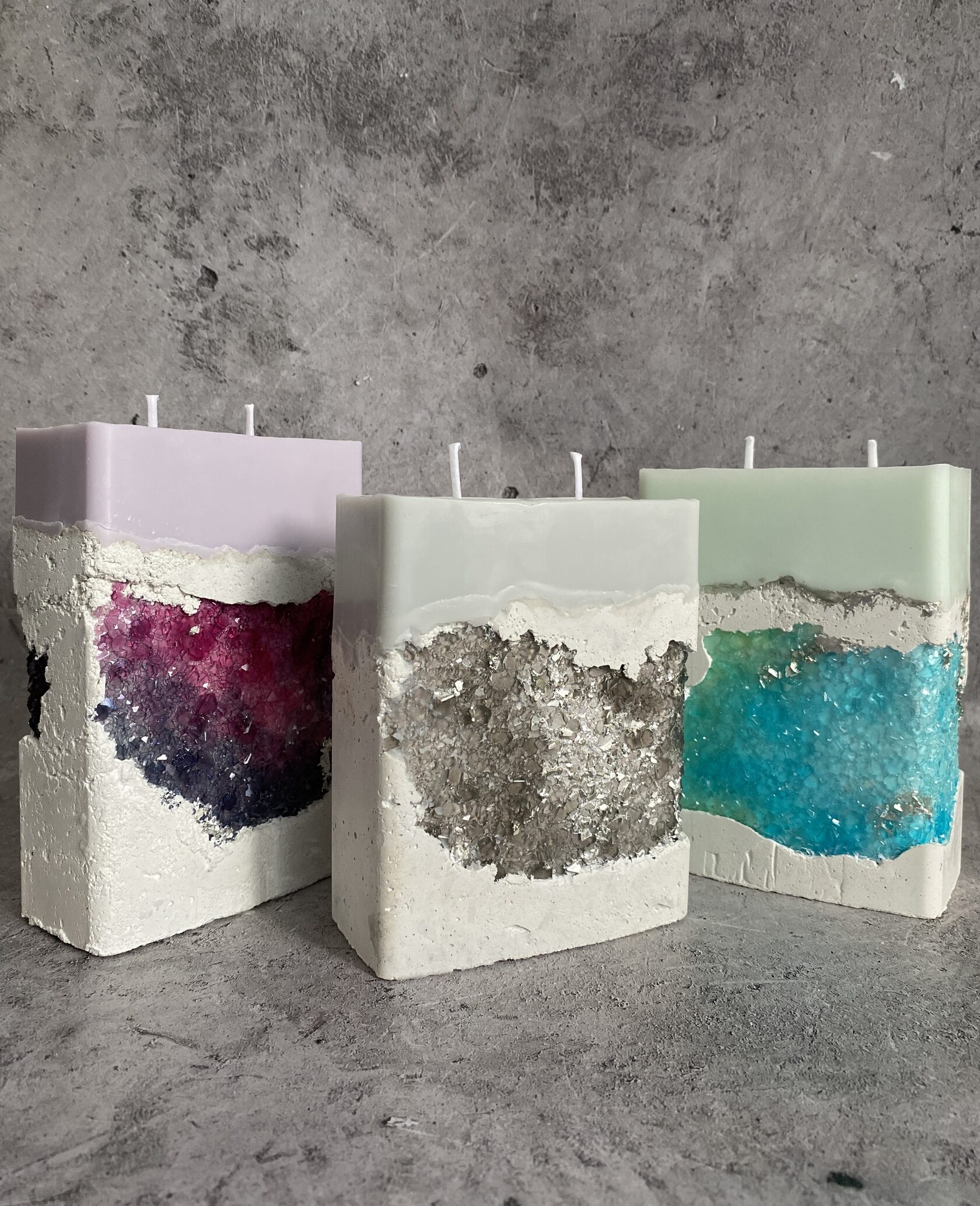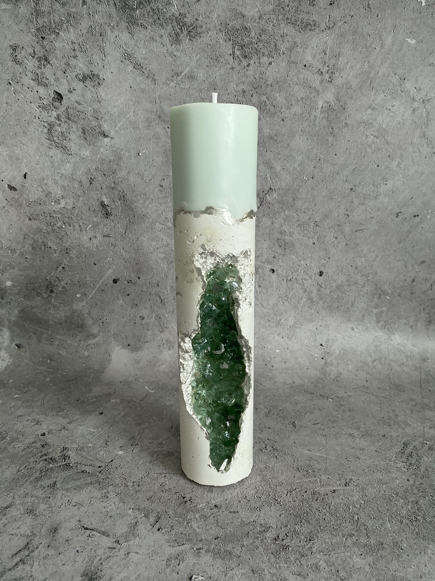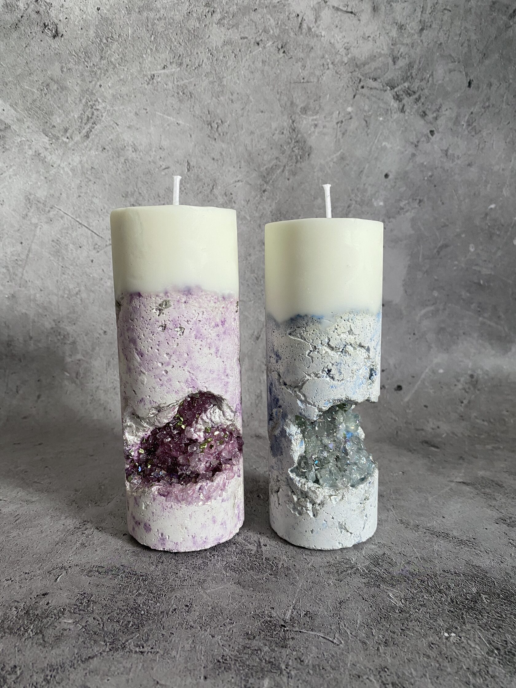Это не просто свеча, это целая история, застывшая в бетоне. Подсвечник брутальный, прямоугольный, массивный, с фактурой, которая камня. Кажется, что его только что откололи от горного массива. А внутри как будто природа сама решила создать чудо: из суровой каменной толщи прорастают сверкающие кристаллы. Словно настоящая жеода, живая и искрящаяся, создающая невероятный контраст с грубостью бетона. Это не просто предмет интерьера, это арт объект, который притягивает взгляд и заставляет задуматься о величии природы.