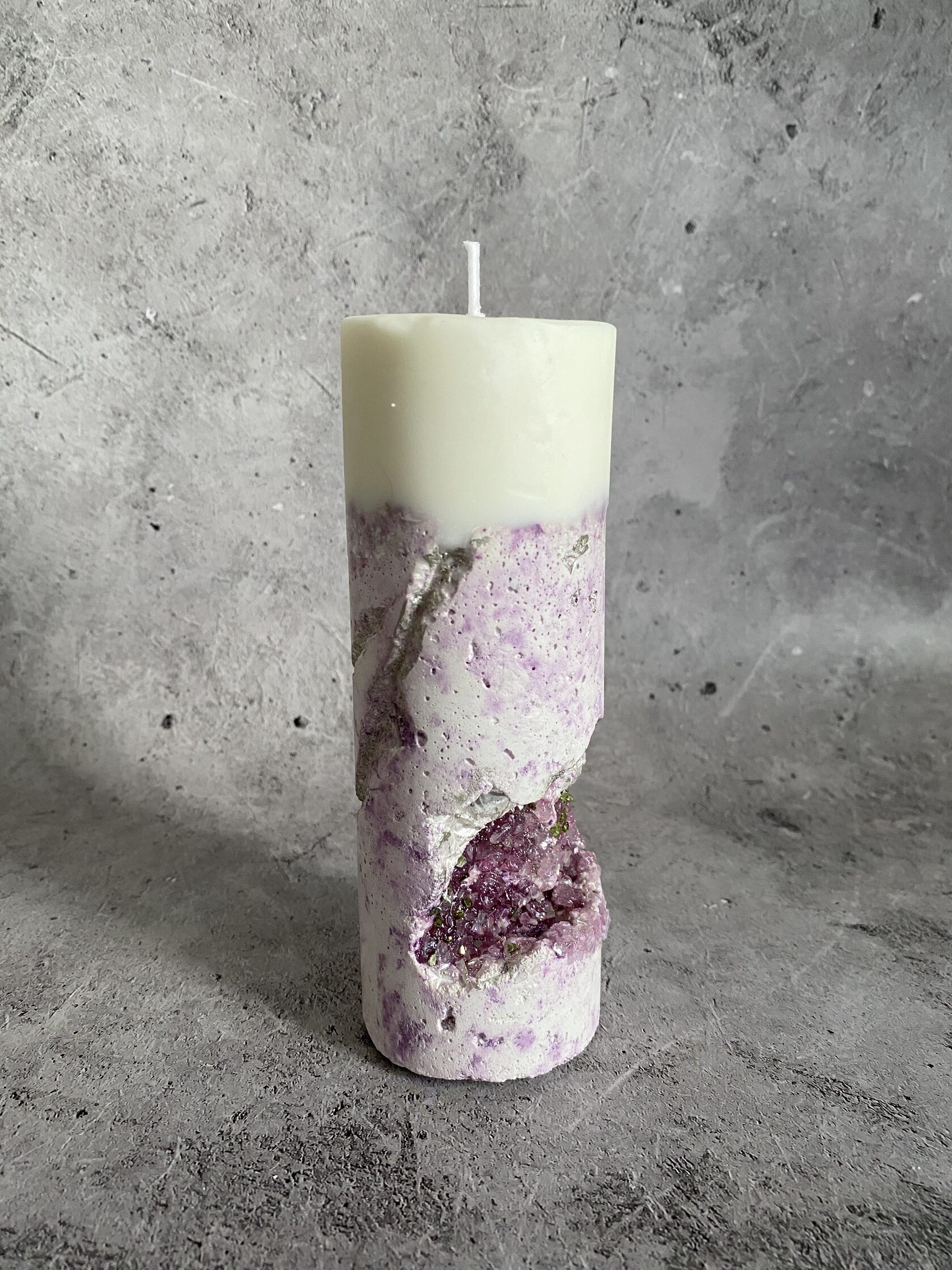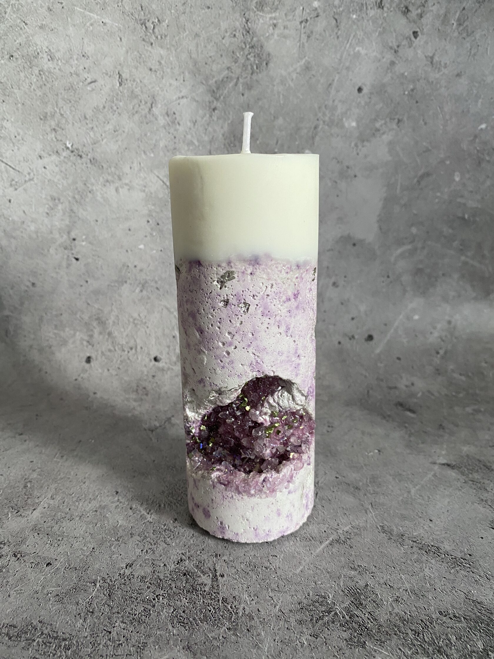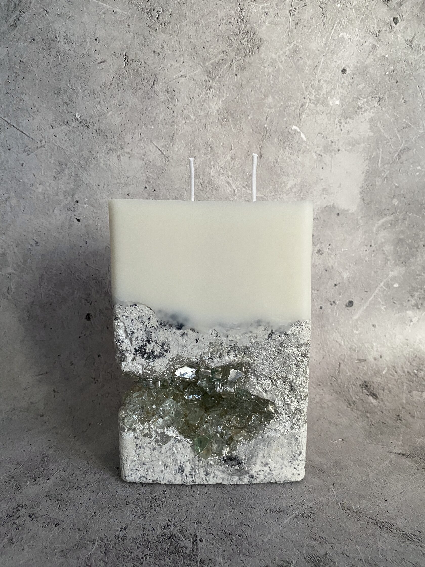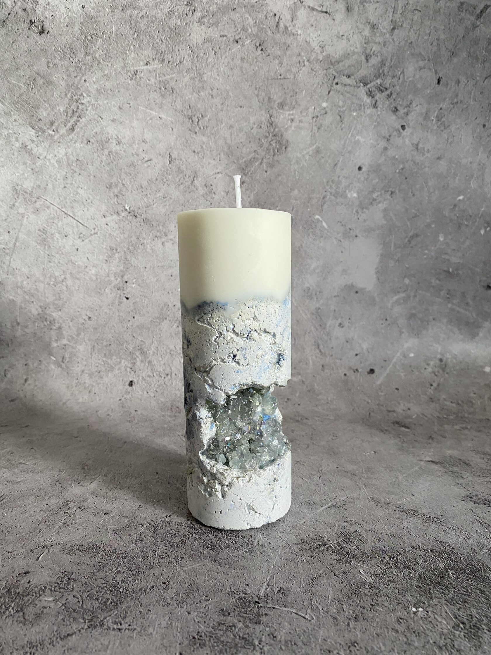 Настоящий арт-объект - бетонный прямоугольник, но не обычный, а словно высеченный из гигантского белого камня. Его поверхность не идеально гладкая, а слегка шероховатая, с естественными неровностями, которые придают ему аутентичность и ощущение прикосновения к природе. В этом "камне" проявилась настоящая кристальная друза – скопление мерцающих кристаллов. При дневном свете они выглядят как застывшие капли росы, а когда вы зажигаете свечу пламя, отражаясь в гранях кристаллов, создает завораживающее мерцание. Этот подсвечник – не просто функциональный предмет, это произведение искусства, которое сочетает в себе грубую красоту бетона и изящество кристаллов