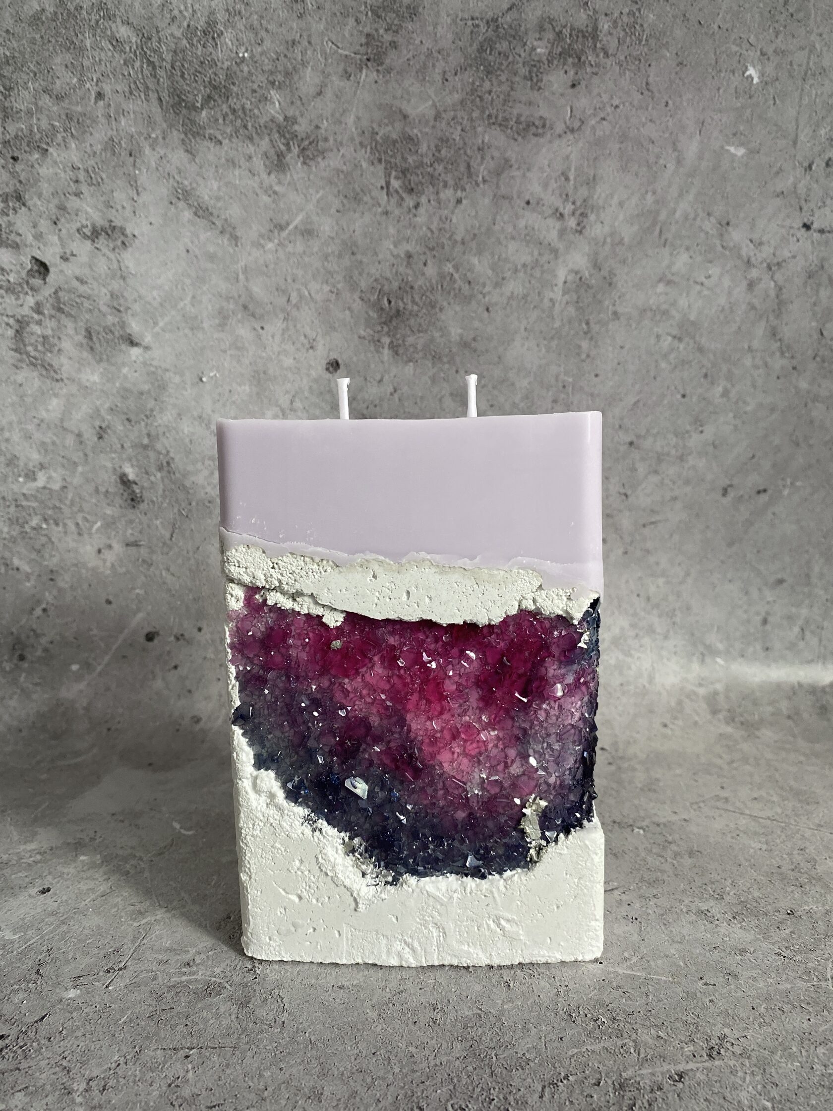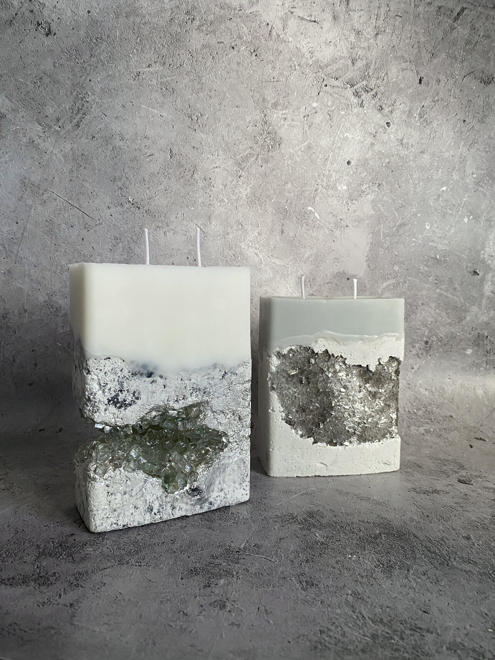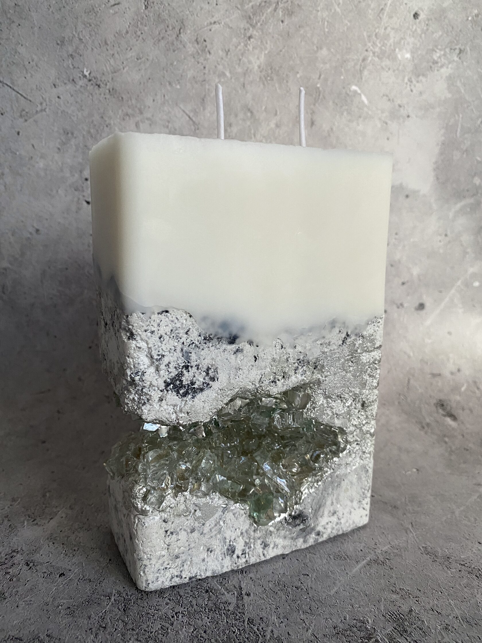 Настоящий арт-объект - бетонный прямоугольник, но не обычный, а словно высеченный из гигантского белого камня. Его поверхность не идеально гладкая, а слегка шероховатая, с естественными неровностями, которые придают ему аутентичность и ощущение прикосновения к природе. В этом "камне" проявилась настоящая кристальная друза – скопление мерцающих кристаллов. При дневном свете они выглядят как застывшие капли росы, а когда вы зажигаете свечу пламя, отражаясь в гранях кристаллов, создает завораживающее мерцание. Этот подсвечник – не просто функциональный предмет, это произведение искусства, которое сочетает в себе грубую красоту бетона и изящество кристаллов