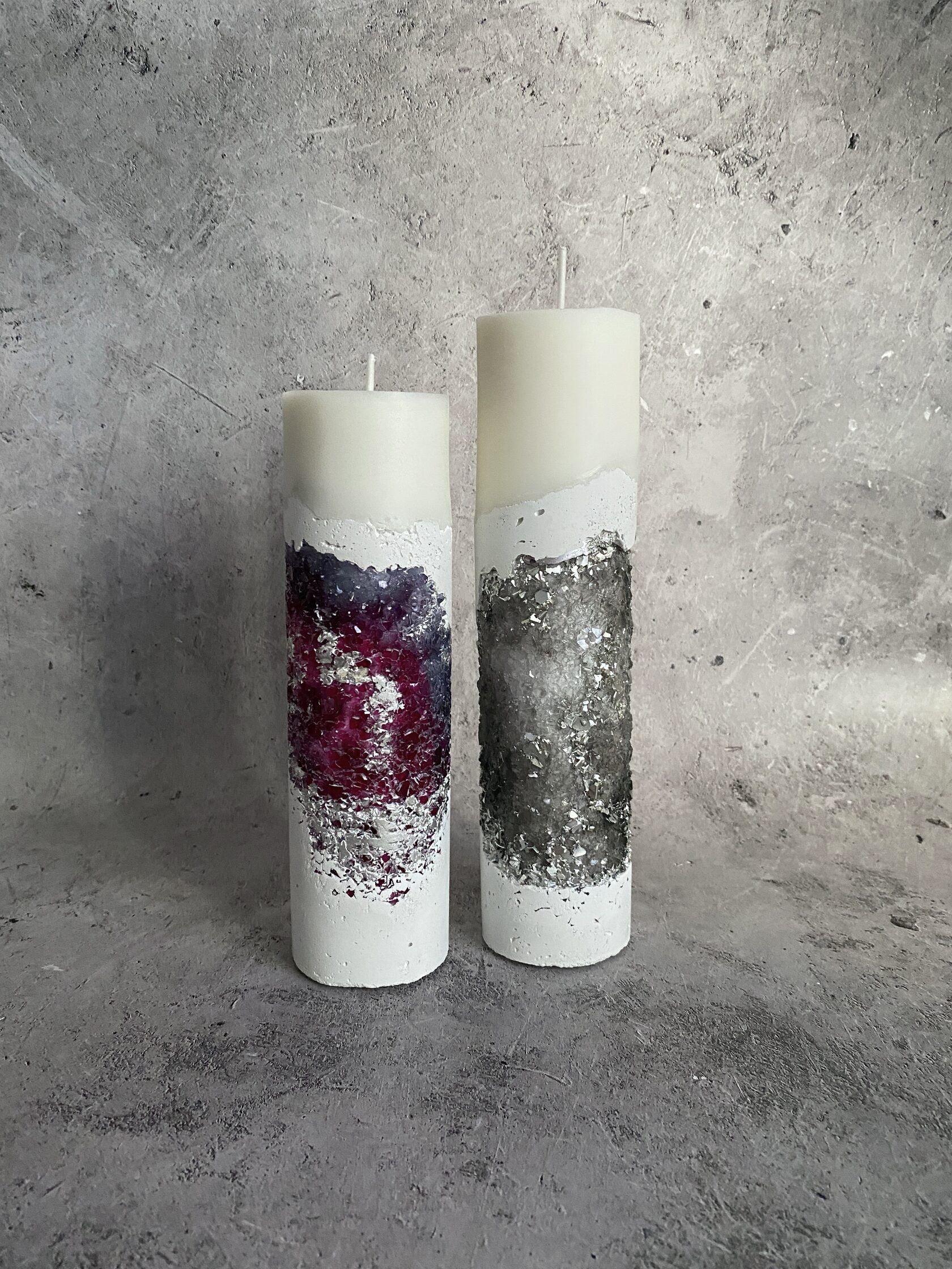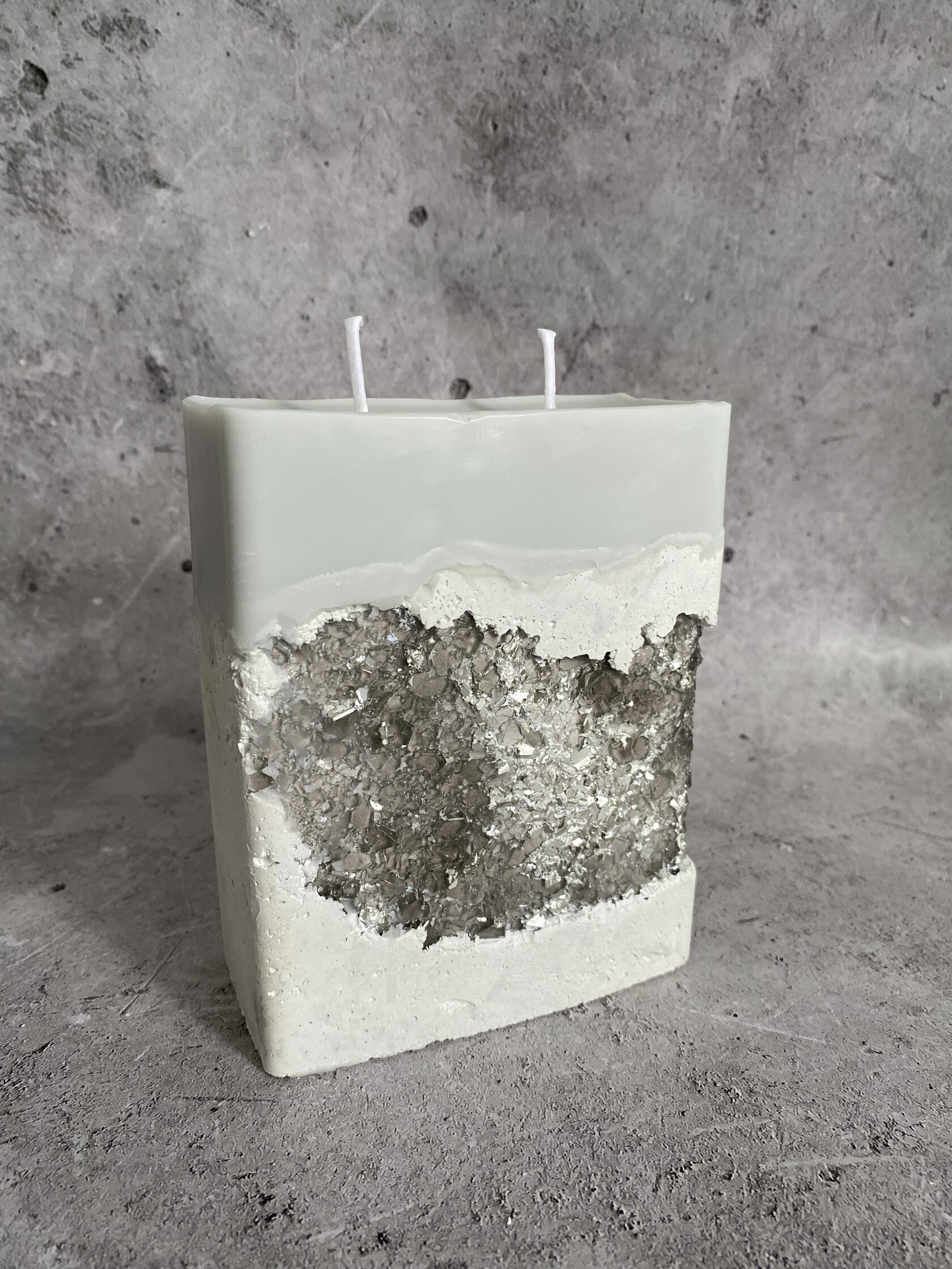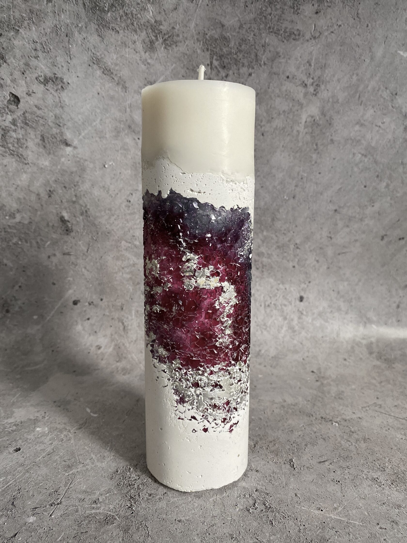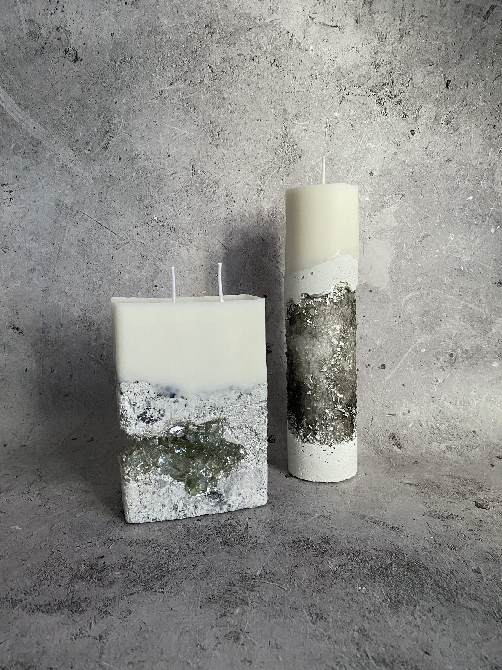 Настоящий арт-объект - бетонный прямоугольник, но не обычный, а словно высеченный из гигантского белого камня. Его поверхность не идеально гладкая, а слегка шероховатая, с естественными неровностями, которые придают ему аутентичность и ощущение прикосновения к природе. В этом "камне" проявилась настоящая кристальная друза – скопление мерцающих кристаллов. При дневном свете они выглядят как застывшие капли росы, а когда вы зажигаете свечу пламя, отражаясь в гранях кристаллов, создает завораживающее мерцание. Этот подсвечник – не просто функциональный предмет, это произведение искусства, которое сочетает в себе грубую красоту бетона и изящество кристаллов