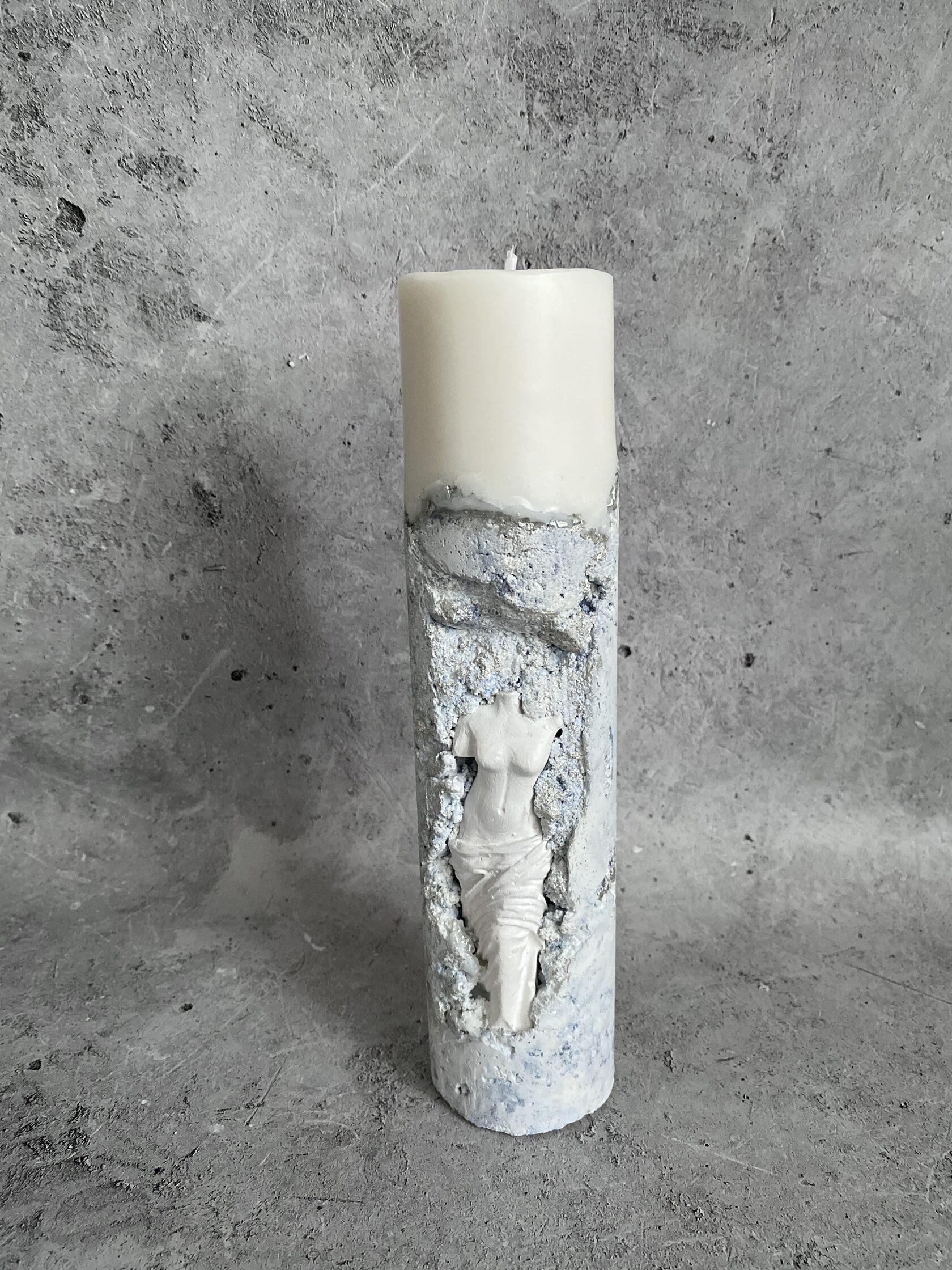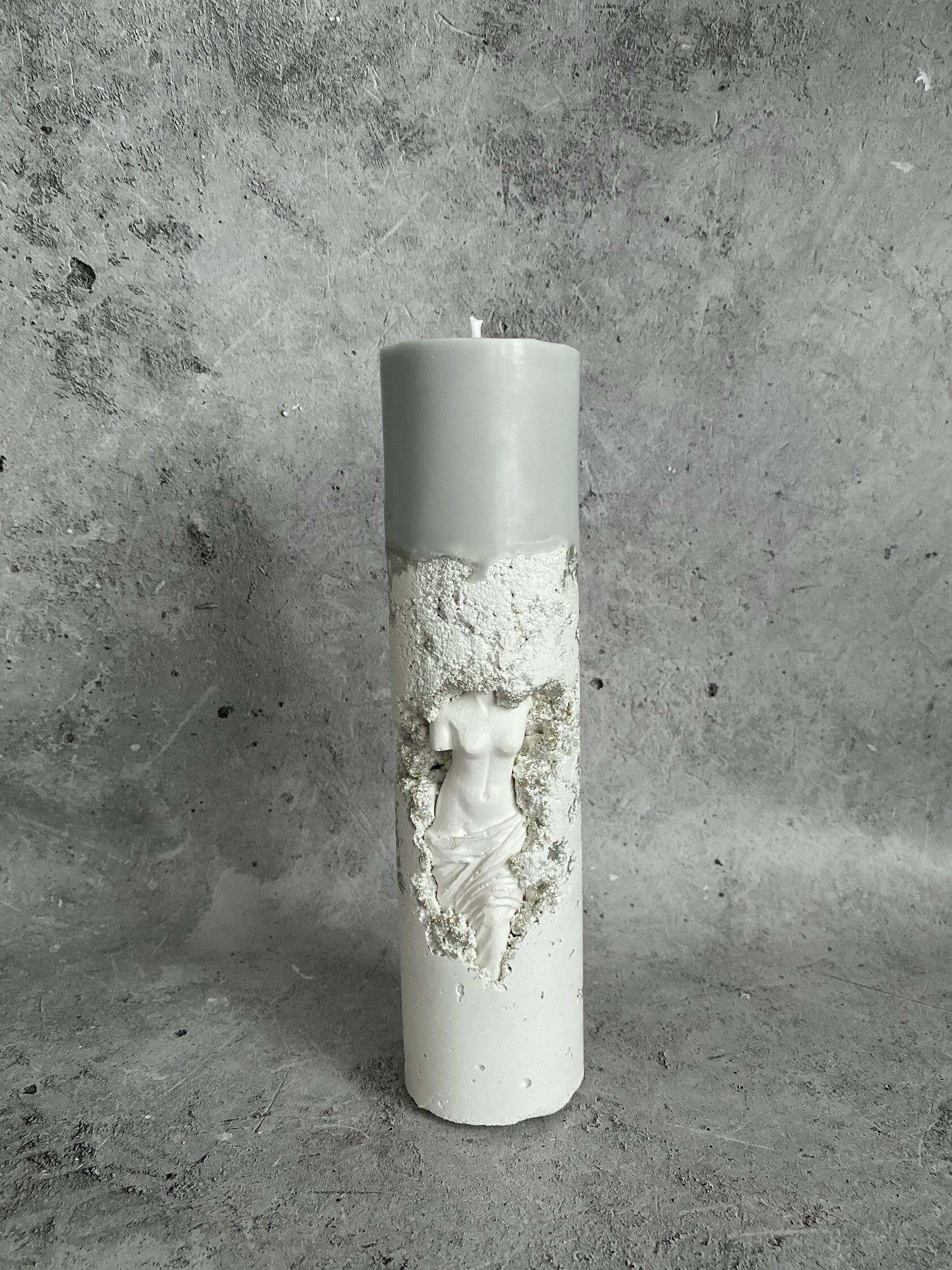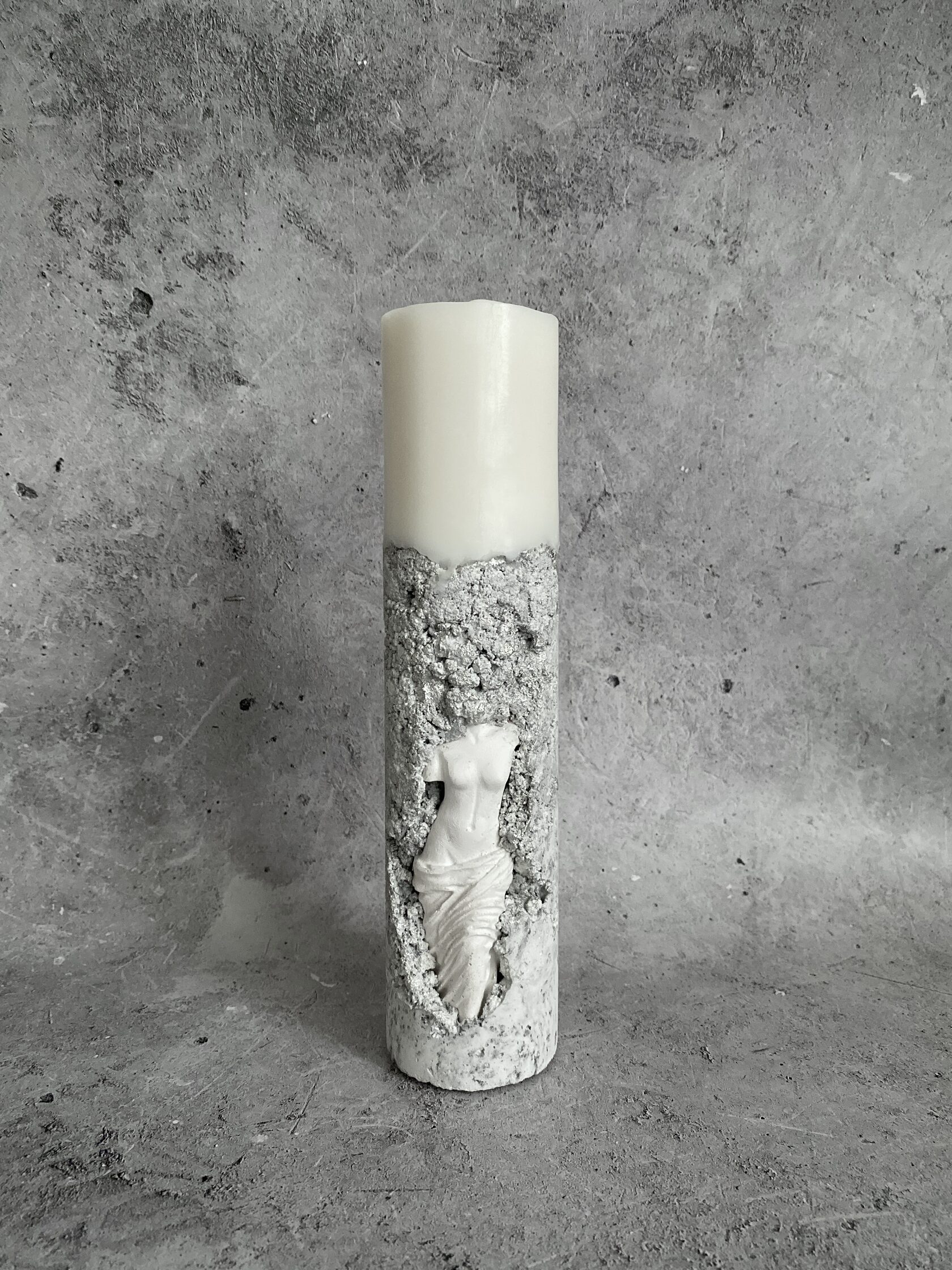 Свеча на подсвечнике из необработанного бетона, с его характерной грубой фактурой. В каждой поре чувствуется тяжесть и основательность камня. И из этой суровой материи, словно мираж, вырастает нежнейшая Венера Милосская. Ее гипсовая фигура с безупречными линиями и античной красотой, кажется почти невесомой на фоне мощного бетона. Это столкновение стихий: первобытной силы и изысканной красоты. Зажгите свечу, и пламя оживит этот удивительный тандем, отбрасывая причудливые тени на их столь разные, но идеально дополняющие друг друга фактуры.