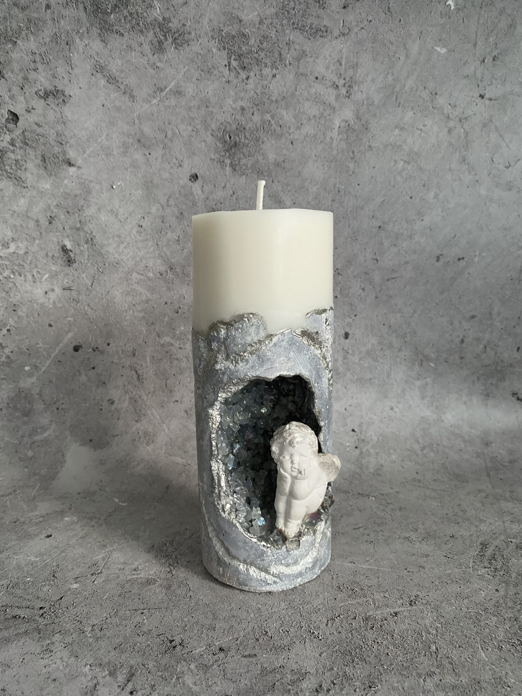 В этом подсвечнике из грубого бетона, словно в сердце древней горы, застыла тишина и тайна. Свеча, её нежное пламя, освещает целый мир, где в мерцании декоративных кристаллов сидит Амур. Не просто ангел, а воплощение мечты, погруженный в свои сокровенные мысли. Его присутствие здесь наполняет пространство ощущением чего-то волшебного. Это искусство, которое говорит с душой.