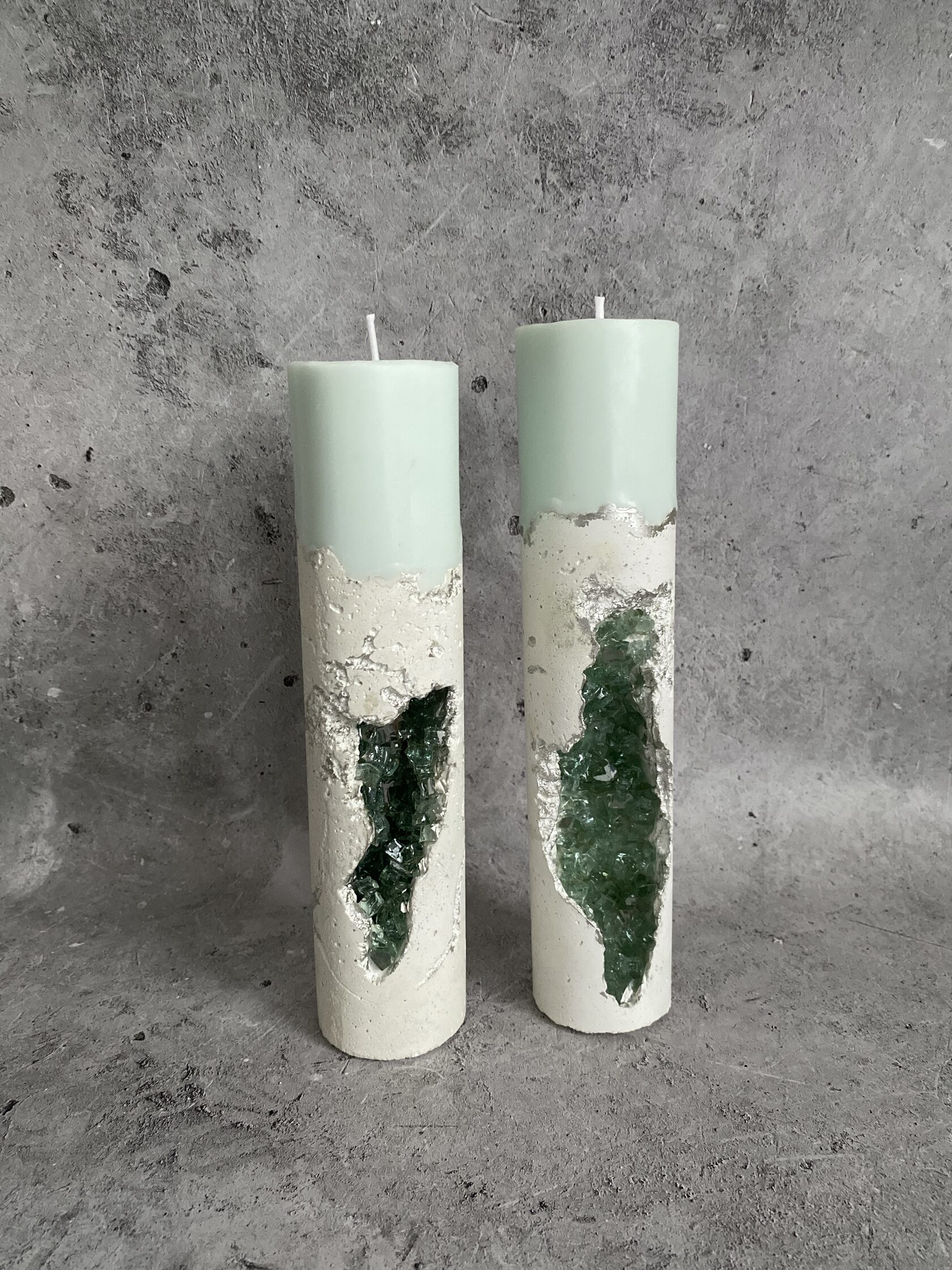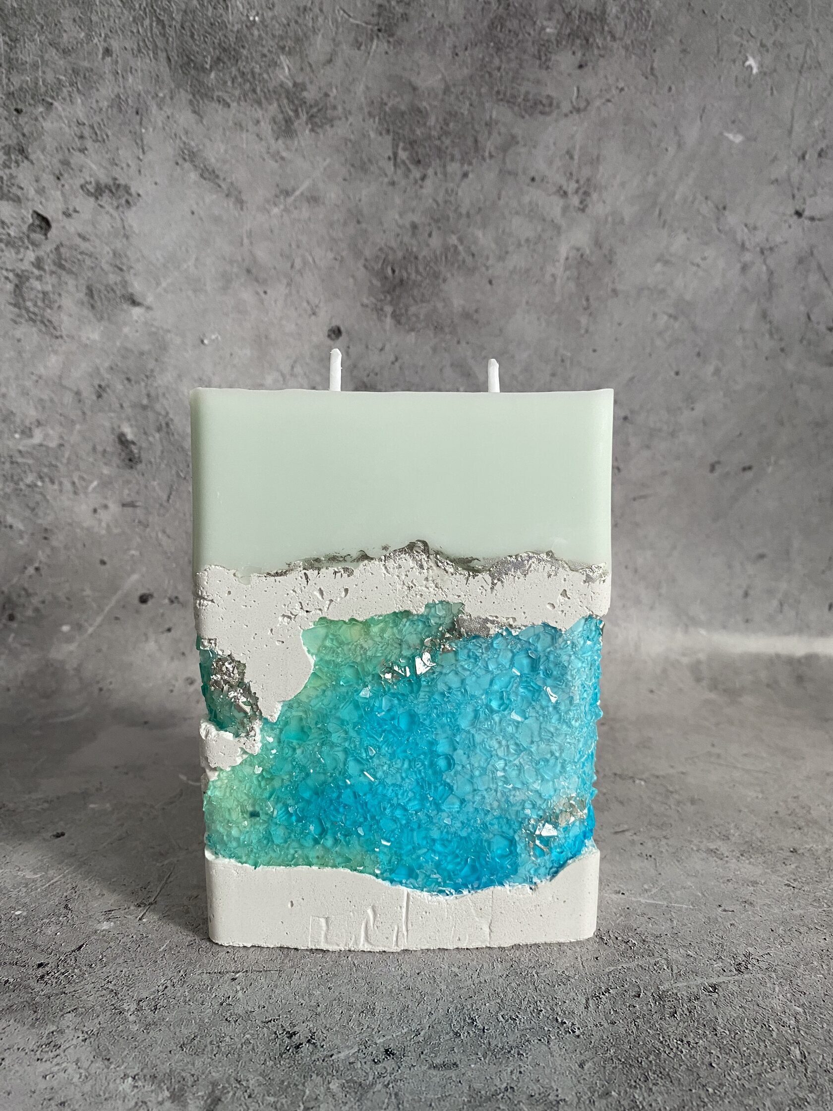 Голубое бетонное ущелье, оживающее в свете свечи. Фактурная поверхность, нежный цвет и россыпь переливающихся кристаллов создают завораживающую игру света, напоминающую о красоте горных пейзажей.