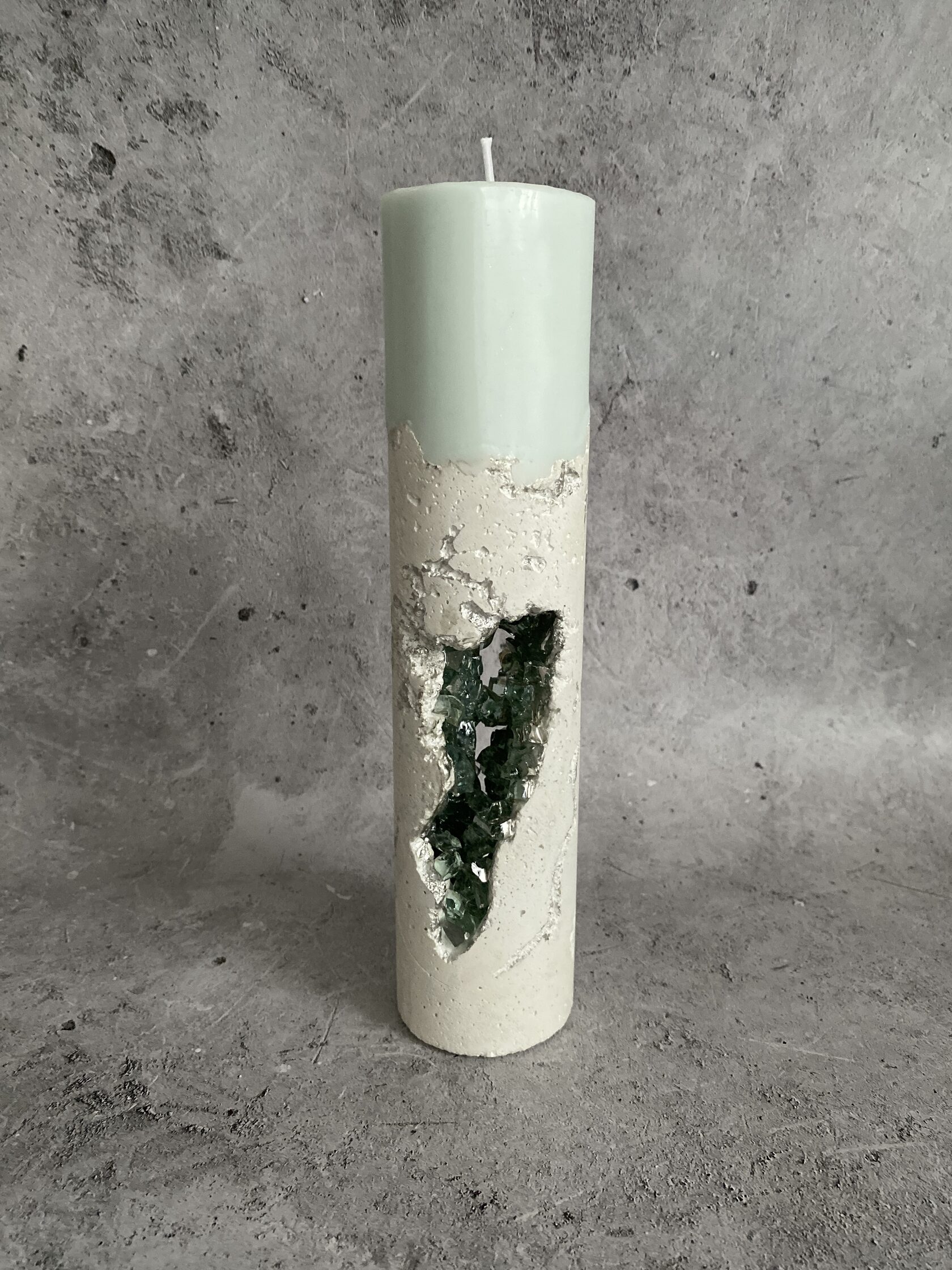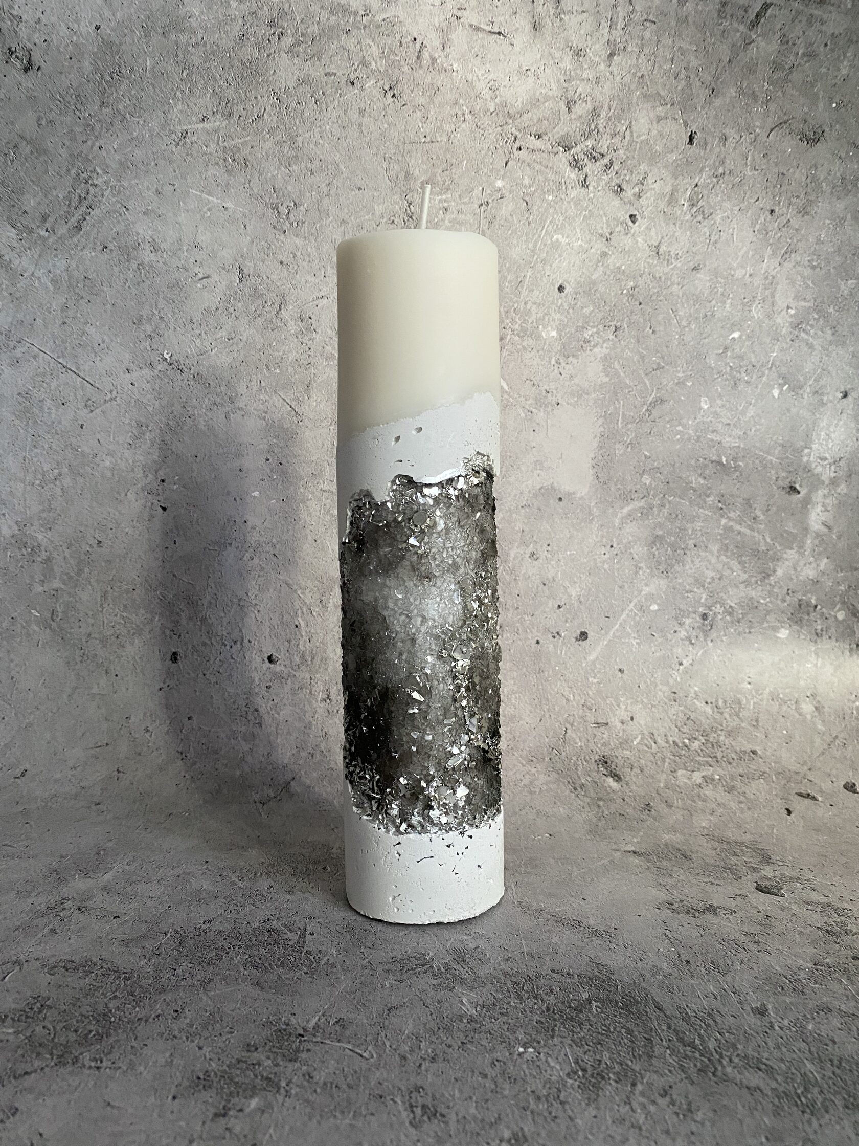 Высота 15 см Диаметр 5 см Состав: бетон, гипс, акрил, зеркальная крошка, соевый воск